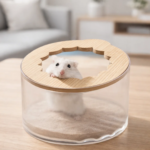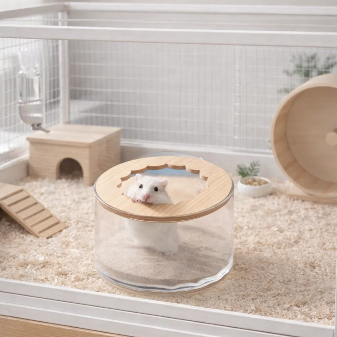 Baño para hámster con tapa. Ideal para higiene y cuidado del pelaje. Diseño práctico que evita derrames y mantiene la jaula limpia.