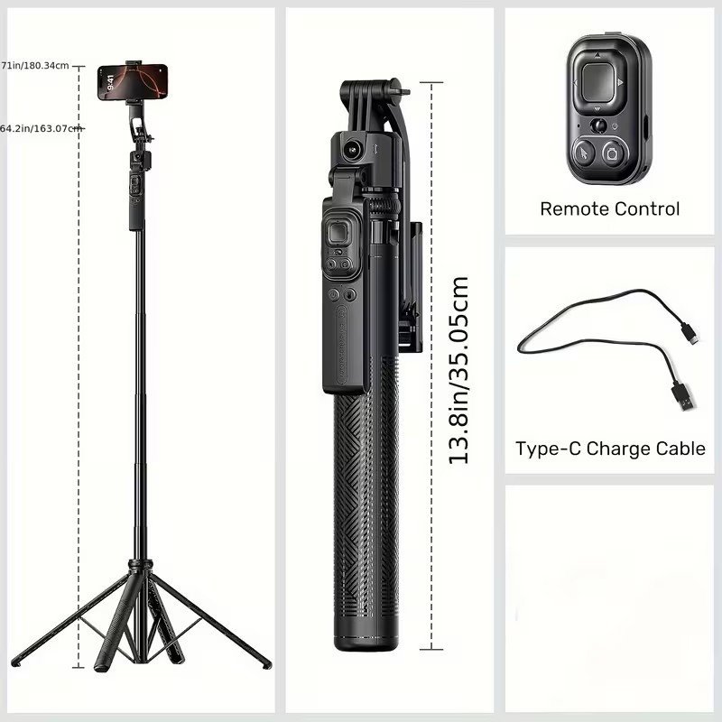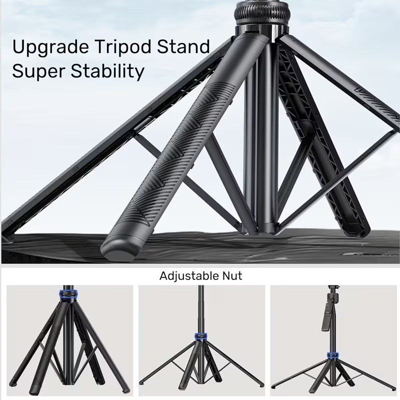 Con una altura máxima de 1.80 m, este trípode Baihuo ofrece gran estabilidad y resistencia incluso en exteriores. Gracias a su diseño inteligente, cuando lo extiendes y lo sueltas al suelo, las patas se abren automáticamente para facilitar su uso instantáneo.