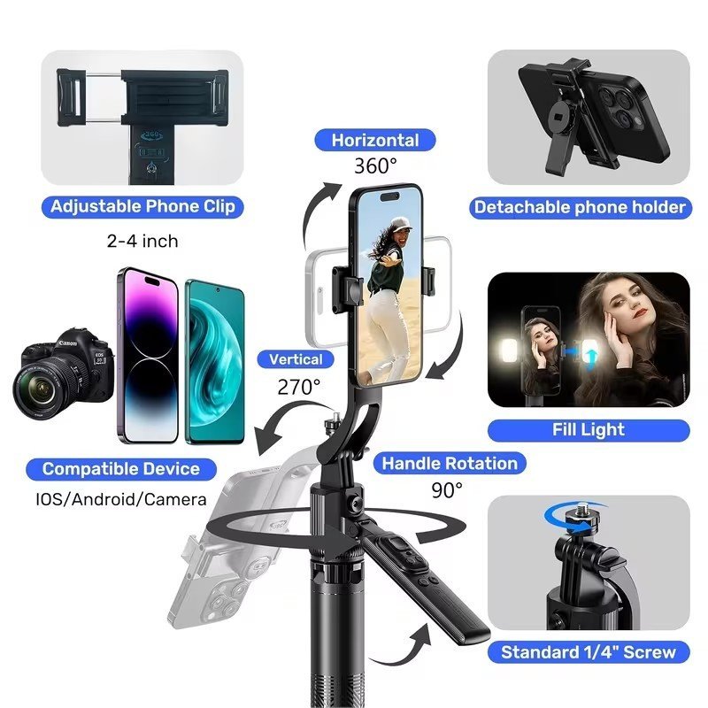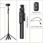 Incluye un control remoto Bluetooth con función para tomar fotos, subir y bajar volumen, y controlar la grabación sin estar frente al celular. No requiere aplicaciones externas: solo coloca tu dispositivo, enciende y déjalo rastrear tu movimiento con precisión.